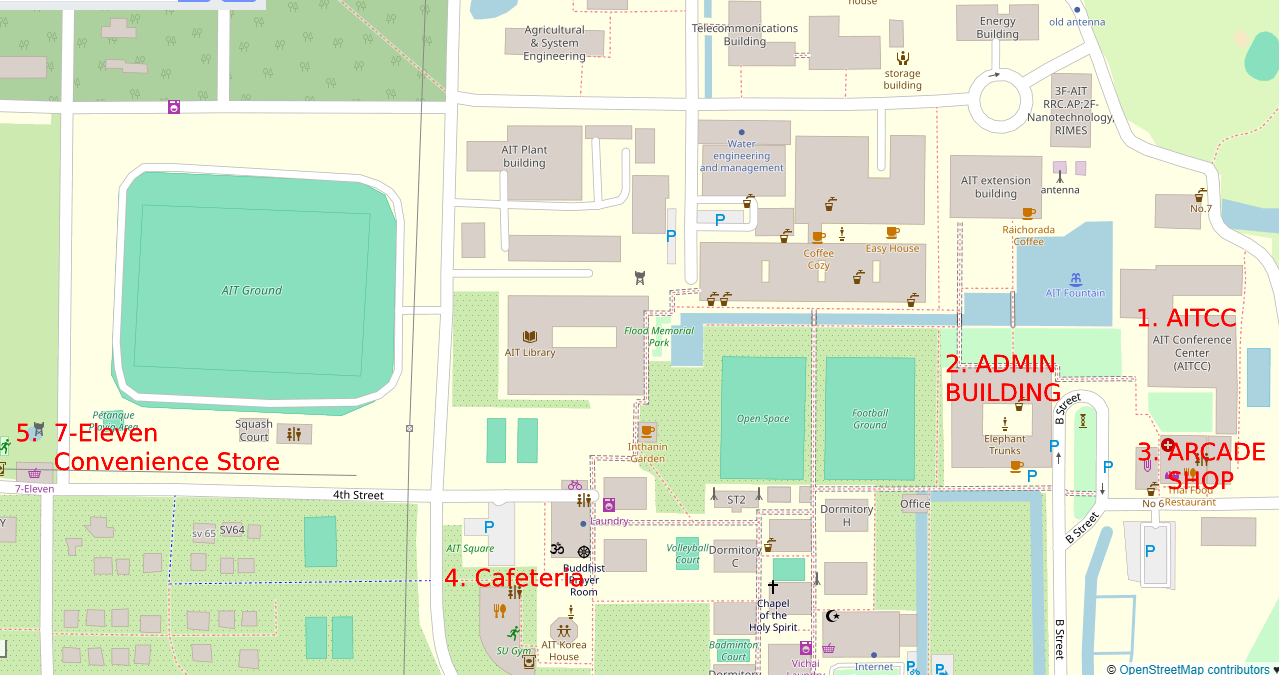 Please refer to the campus map below for key locations such as the conference center, accommodation, and dining areas within AIT.